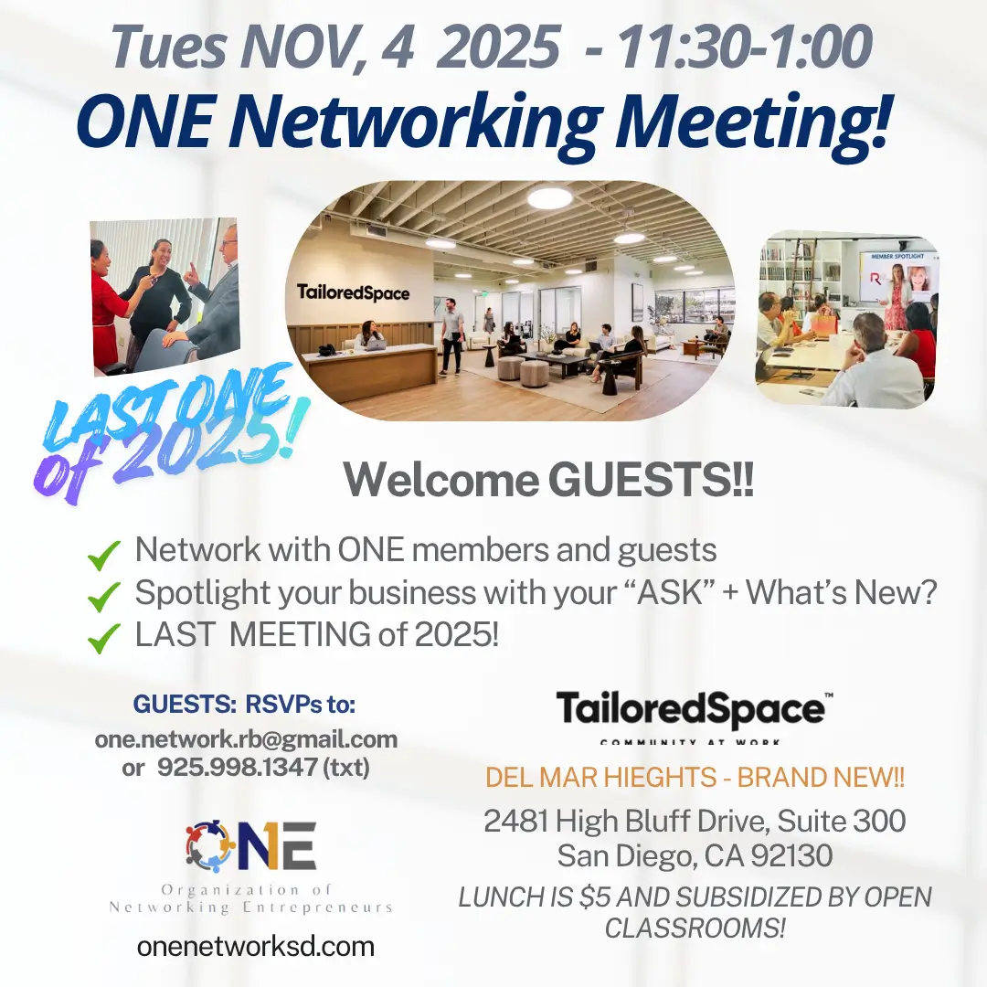 Interested? Must register by 1:00 PM the day before to receive the guest list and plan your networking strategically. If you’re new to ONE, and an entrepreneur or leader in a business located in San Diego County, contact us directly to get in first time for free!